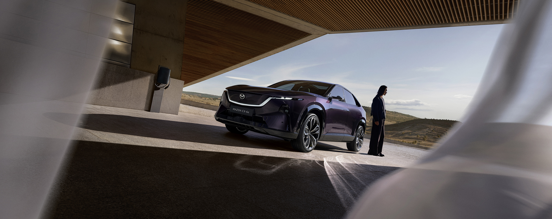 Azoknak, akik a konvenciók helyett valami különlegesre vágynak: a vadonatúj Mazda CX-6e új irányt ad „Kodo: A mozgás lelke” formanyelvünknek. Robusztus felépítése és áramvonalas profilja a futurisztikus megjelenés és az érzelmeket megszólító design ötvözete. Fénnyel játszó formája minden kontúrt élettel tölt meg, még álló helyzetben is, különösen az új Nightfall Violet színben. Tisztán elektromos SUV modellünket úgy terveztük, hogy a vezető és az autó között bensőséges kapcsolatot teremtsen – ezt az érzést nevezzük Jinba Ittai-nak. Minden utazás kényelmes, harmonikus és összetéveszthetetlenül Mazda: sima, csendes teljesítmény, precíz reagálás és akár 484 km-es hatótáv.