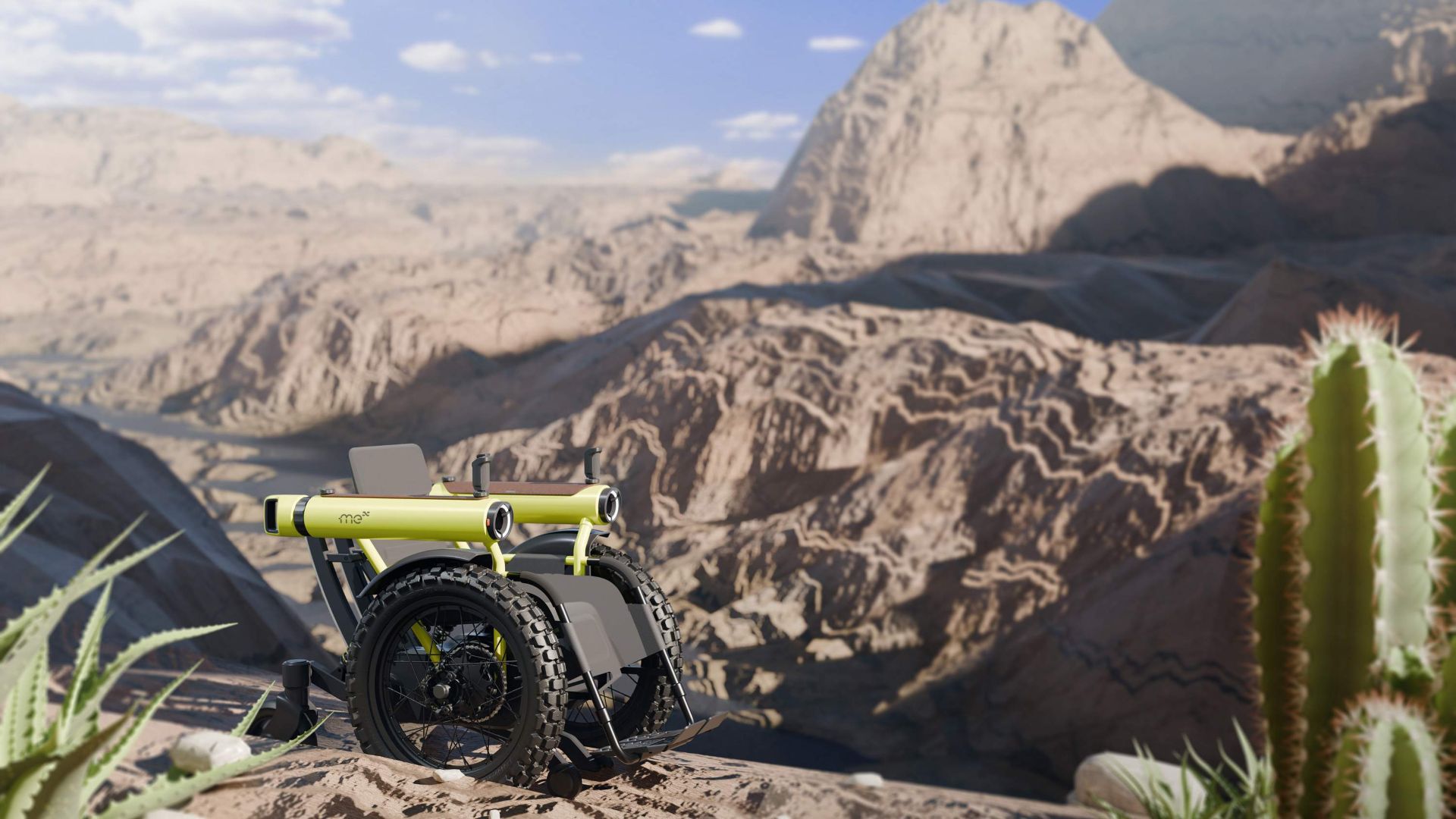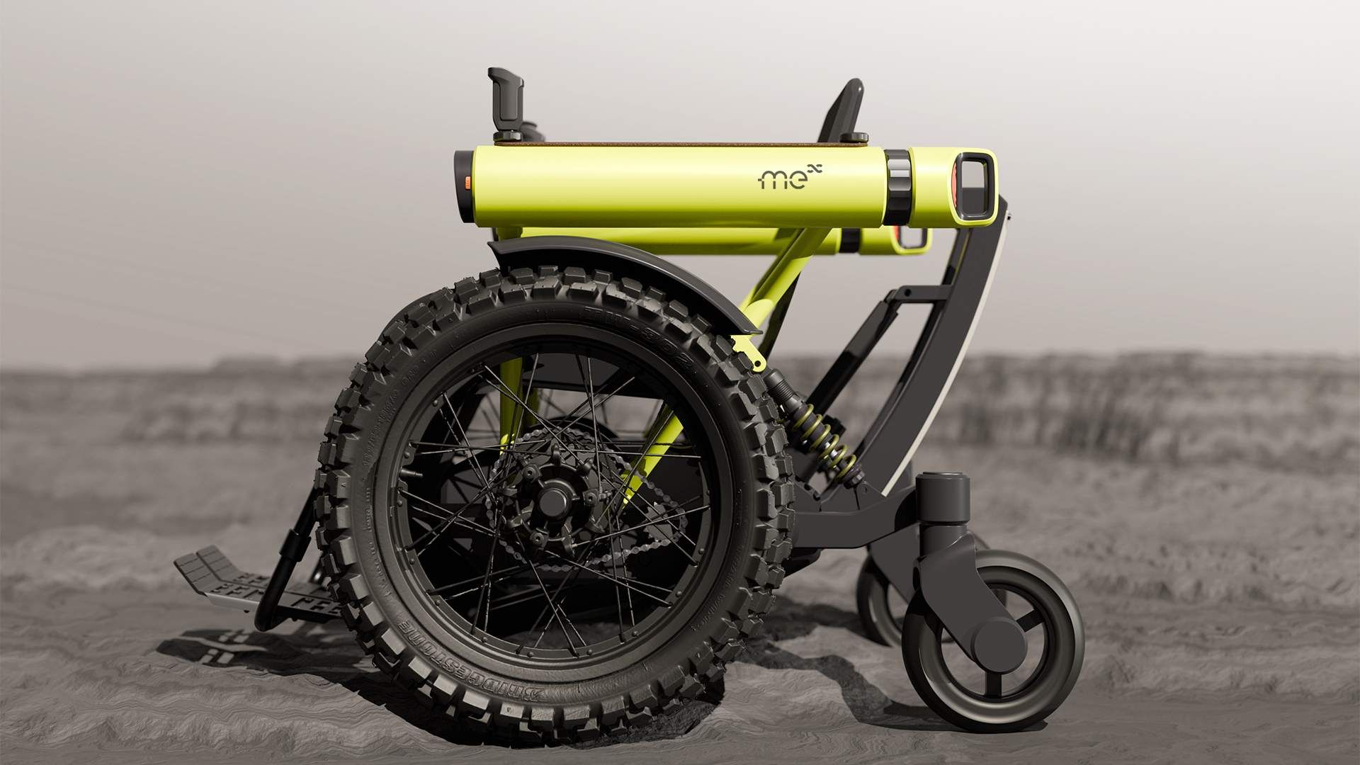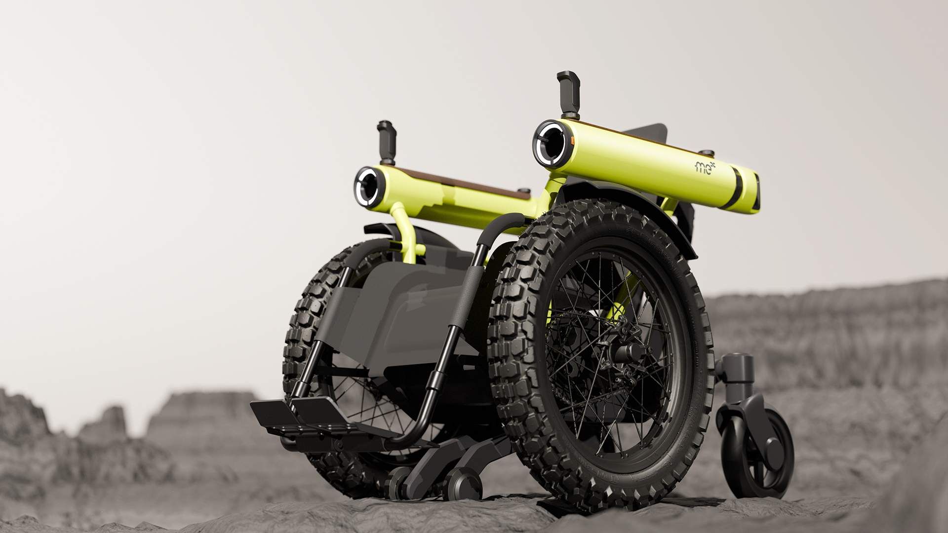 A motorizált kerekesszékeket általában sík felületre, csekély szögű emelkedőkre tervezik. A Toyota Challenge Me ezzel szemben terepjáróként küzdi le nemcsak a járdaszegélyeket, de akár a hegyi ösvényeket, vízmosásokat is. Hátsó kerekei hosszú úton rugóznak, az elsők sárban, homokban is megkapaszkodnak, egy kihajtható hátsó „láb” pedig megtámasztja a széket, ha a felhasználó túl meredek emelkedőn próbálna felkapaszkodni. A kartámaszok vaskos hengerek, amelyekbe fényszórókat és hátsó helyzetjelzőket építettek, és még ki tudja, mit – látványnak mindenesetre meglehetősen robusztusak.
