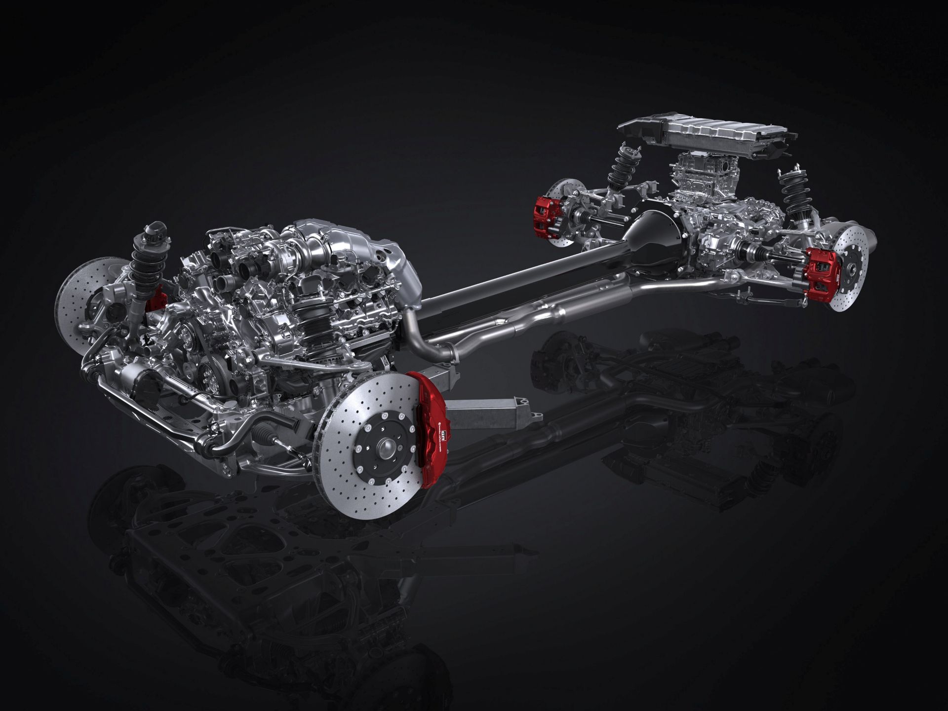 A könnyű, de merev karosszéria és az arra erősített szénszálas borítólemezek lehetővé tették, hogy a mérnökök teljes egészében a hajtáslánc elemeinek megfelelő elhelyezésével alakítsák ki az ideális tömegeloszlást. Az orrmotor az első tengely mögé került, a sebességváltó pedig leghátul, a differenciálmű mögött helyezkedik el. A villanymotor – mert hiszen a Toyota GR GT hibrid – a sebességváltóhoz illeszkedik, a fejlesztési célokban meghatározott rendszerteljesítmény 650 lóerő. A végsebesség valahol 320 km/óra felett lesz.